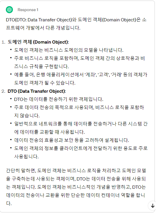 또한 만들다 보니까 dto와 domain의 역할이 다르기는 하지만 굉장히 비슷하다는 생각이 들었다. 그래서 gpt한테 질문해봤다.